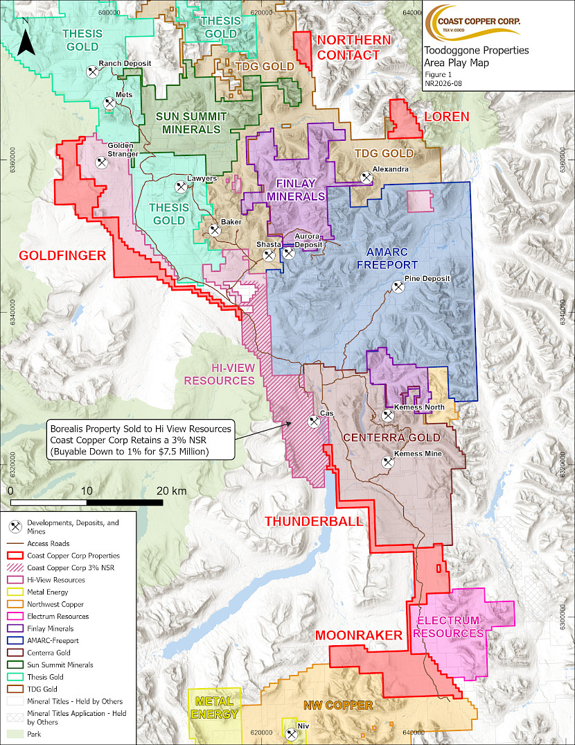 Vancouver, BC – Coast Copper Corp. (“Coast Copper” or the “Company”; TSX-V: COCO) is pleased to announce it has acquired three new properties through staking in the Toodoggone mining camp of northcentral British Columbia (“BC”). The properties were recently granted under the new BC Mineral Claims Consultation Framework. The Goldfinger, Thunderball and Moonraker properties total approximately 18,683 hectares (“ha”) and together with the Borealis property, which Coast Copper sold to Hi-View Resources Inc. (see news release dated September 24, 2025), cover a continuous 90 kilometre (“km”) long belt along the western side of the Toodoggone camp (see Figure 1). These three new properties (the “Bond Properties”), along with the Company’s Loren and Northern Contact properties on the eastern side of the Toodoggone camp now total approximately 21,156 ha and make Coast Copper the single largest acquirer of new claims in the Toodoggone since the Aurora discovery by Amarc Resources Ltd. (“Amarc”) announced on January 17, 20251.