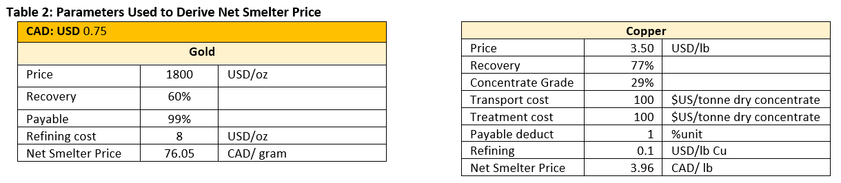 NSR = (Cu%/100) x CAD$ 3.96/lb x 2204.6 lbs/tonne x 77% + Au gpt x CAD$76.05/g x 60%