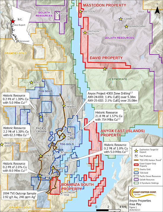 Coast Copper congratulates TDG on its recent discovery of the new ‘4300 Zone’ volcanogenic massive sulphide (“VMS”) lens which sits below the former producing Hidden Creek mine at TDG’s Anyox project1,4 and which it acquired in July 2025. The Company also wishes to congratulate Goliath who has been reporting numerous high-grade gold intercepts from its Surebet discovery1 approximately 20 kilometers (“km”) to the north of Anyox. Coast Copper holds some of the only mineral claims adjacent and internal to the Goliath ground.