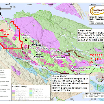 The Knob Hill NW property is lcoated on northern Vancouver Island, appoximately 60 km northwest of the Empire Mine Property and is located at the western end of a 50 km trend that originates at the past producing Island Copper Mine and passes through NorthIsle Copper & Gold Inc.’s project and onto Coast Copper's. Knob Hill NW sits at the north end of a 25-km band of volcanic and intrusives which host zones of alteration and mineralization - the Utah-Expo Belt. Since 1980 sulphide-rich siliceous alteration caps overlying these systems have been shown to contain gold adding a new dimension to exploration potential in the region.