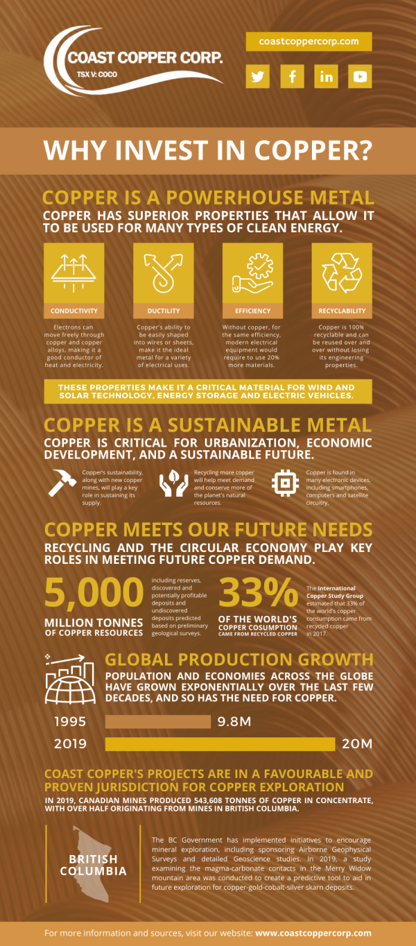 This infograph does not constitute or form part of any offer for sale or solicitation of any offer to buy or subscribe for any securities in Coast Copper Corp., nor shall it or any part of it form the basis of or be relied on in connection with or act as any inducement to enter into any contract or commitment whatsoever. No reliance may be placed for any purpose whatsoever on the information or opinions contained in this infograph or on any other document or oral statement or on the completeness, accuracy or fairness of any such information and/or opinions. No undertaking, representation, warranty or other assurance express or implied is made or given by or on behalf of Coast Copper Corp. or any of its directors, employees or advisors, as to the accuracy or completeness of the information or opinions contained in this presentation and, save in the case of fraud, no responsibility or liability is accepted by any of them for any such information or opinions or for any errors, omissions, misstatements, negligence or otherwise contained or referred to in this presentation.