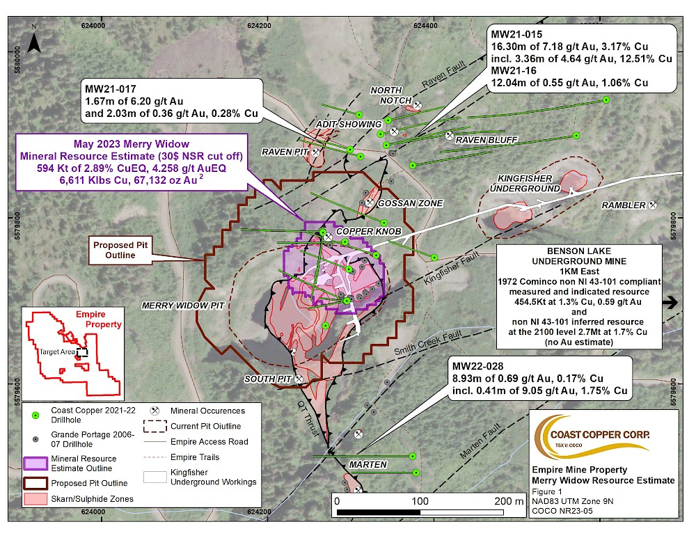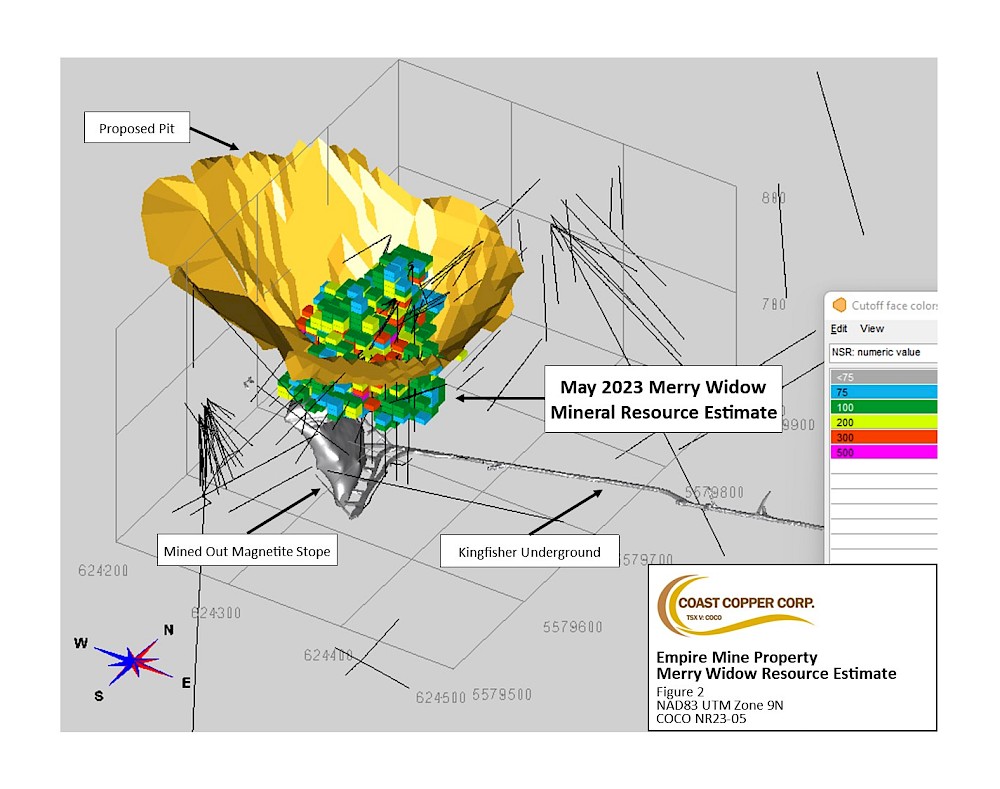 Vancouver, BC – Coast Copper Corp. (“Coast Copper” or the “Company”; TSX-V: COCO) is pleased to announce a National Instrument (“NI”) 43-101 Mineral Resource Estimate (the “2023 MRE”) for the gold-copper Merry Widow open pit located at its optioned Empire Mine property (“Empire Mine”, “Empire” or the “Property”). The 2023 MRE1 updates and improves the 2008 MRE2 published by Grande Portage Resources Ltd and should be considered Coast Copper’s first proof of concept with the results feeding into a scoping study for a “hub and spoke” processing facility previously announced by Coast Copper (see news release March 21, 2023). The updated resource and modeled pit case are shown in Figure 1.
