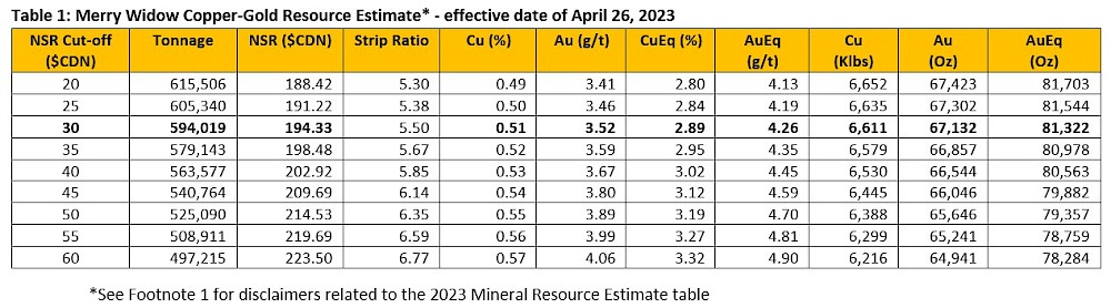 -Inferred Mineral Resource Estimate of 81,322 ounces (“oz”) gold equivalent (“AuEq”) grading 3.52 grams per tonne (“g/t”) gold (“Au”) and 0.50% copper (“Cu”) [4.258 g/t AuEq] contained within 0.59 million metric tonnes (“MT”) (using a net smelter return (“NSR”) cut-off of $30 CDN) (see Table 1)1,