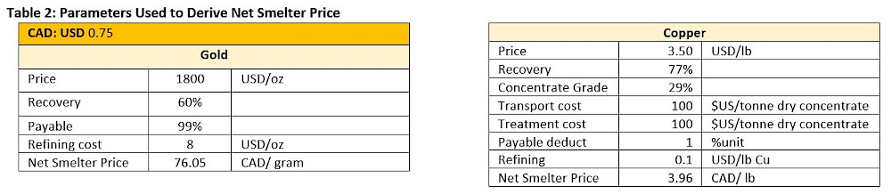 NSR = (Cu%/100) x CAD$ 3.96/lb x 2204.6 lbs/tonne x 77% + Au gpt x CAD$76.05/g x 60%