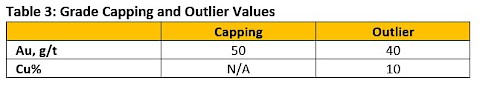 Cumulative Probability Plots were used to establish gold and copper capping and outlier values. The table below summarizes the capping done on the assays prior to compositing and the Outlier Restrictions done to the composites during interpolation. For composite grades above the outlier value provided, and at distances greater than 5 m from the data, the value is essentially capped.