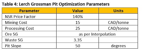 Lerch Grossman pit optimization tools have been used to select a pit shape for limiting the resource. The LG pit targets NSR calculated in each block using copper and gold interpolation results.