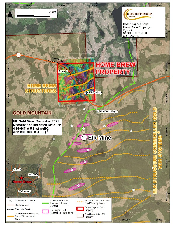 Vancouver, BC – Coast Copper Corp. (“Coast Copper” or the “Company”; TSX-V: COCO; formerly Roughrider Exploration Limited) announces an update on its 100% owned 520-hectare Home Brew property (the “Property”) located in southern B.C. The Property, which is located adjacent to Gold Mountain Mining Corp.’s Elk Gold project¹ 60 kilometers (“km”) east of Merritt, lies along Highway 97c (Okanagan Connector; see Figure 1). The Property covers two undrilled minfile gold occurrences; the Brew and Annie Oakley zones, which cover narrow quartz veins hosting gold and silver values from historical rock samples that assayed up to 2.23 grams per tonne (“g/t”) gold and 1,046 g/t silver, respectively².