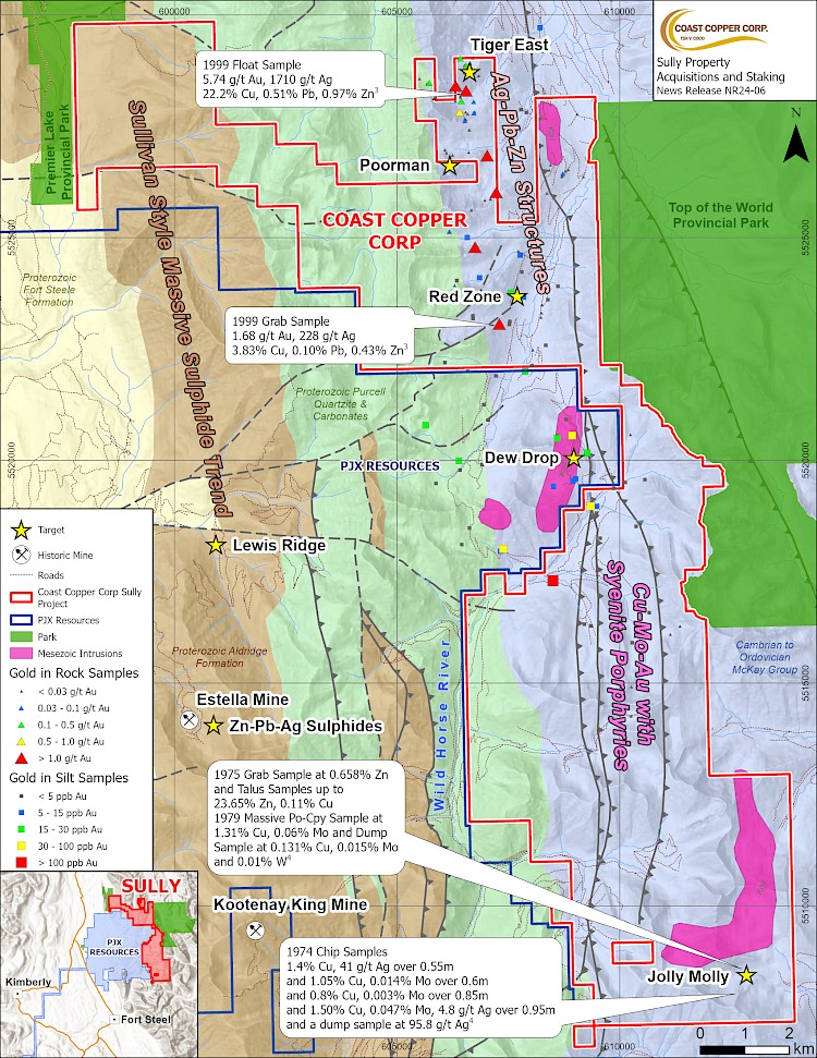 Adam Travis Coast Copper CEO comments: “We are pleased to have increased the size of our Sully Property in the historic Sullivan Mining Camp as it is prospective for both Sullivan-style massive sulphides and also copper, gold and molybdenum porphyries associated with Cretaceous aged monzonite and syenite intrusions. Before PJX made their discovery of Sullivan-style mineralization on claims adjacent to ours, they also noted significant, intrusion related gold, copper and silver mineralization with values up to 15.59 g/t Au, 1.11% Cu and 721 g/t Ag (see PJX news release dated November 15, 2022) ¹ ² ⁵. Consequently, Coast Copper has acquired similar syenite intrusions on the geological trend to PJX’s property. While we remain focused on our Empire Mine property, we continue to complete strategic mineral property acquisitions in areas of interest. We look forward to completing our first field program at Sully in the coming weeks and following up on our new geological understanding of the area.”