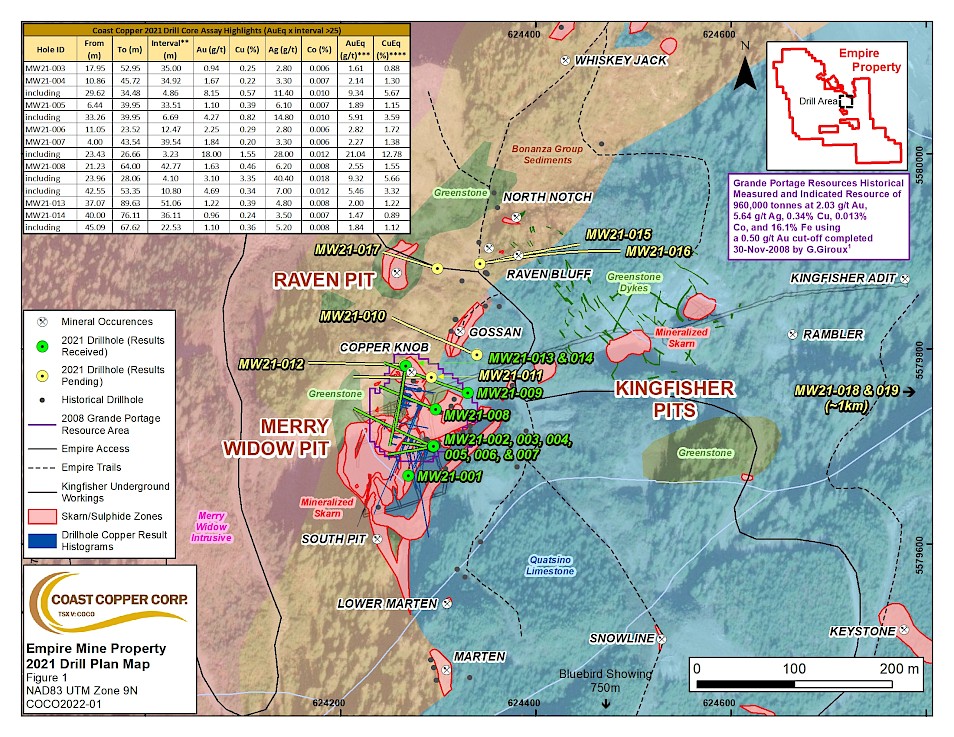 Adam Travis, Coast Copper’s CEO commented, “We are very pleased to report our first batch of assay results from our first drill program at the Empire Mine Property within one month of completing the program. This drilling has confirmed, infilled and extended copper, gold and magnetite mineralization with silver and cobalt credits around the historical Merry Widow past producing iron ore open pit mine. These drill results have returned significant copper-gold intercepts some which could have been longer as many holes terminated in mineralization before ending in underground workings. We are also documenting and assaying magnetite intervals which could add to the potential value of the project. We look forward to receiving more assay results from the Raven and North Notch Zones located approximately 200 m north of the Merry Widow Pit and from two drillholes completed at the end of the program approximately 1.2 kilometers to the east. We look forward to displaying our drillcore at the AMEBC Roundup February 3rd and 4th, 2022 in Vancouver, B.C.”