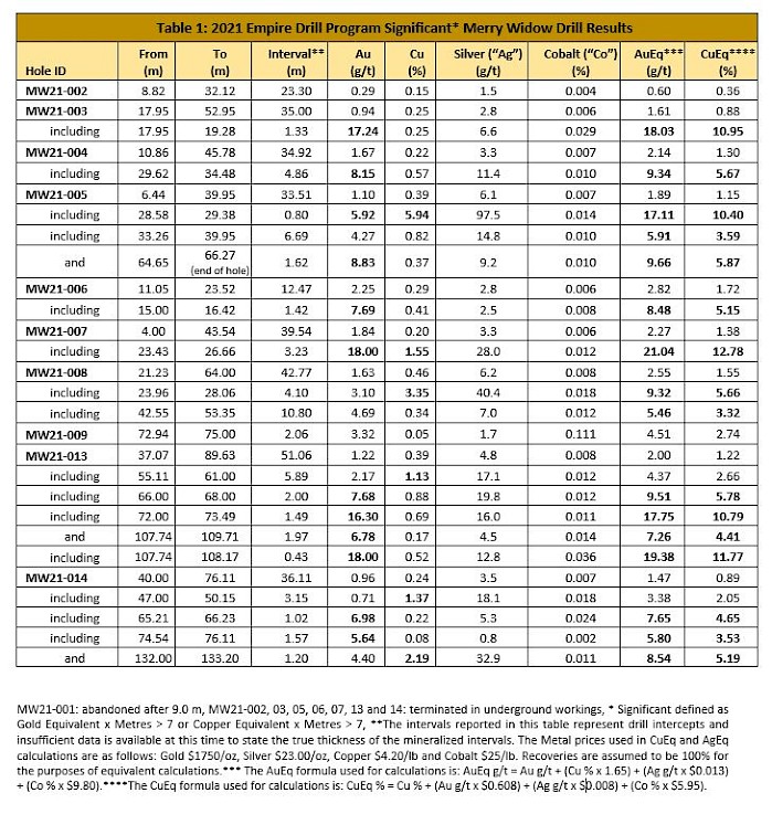 - Broader intercepts included: MW21-004: 1.67 grams per tonne (“g/t”) gold (“Au”) and 0.22% copper (“Cu”) over 34.92 metres (“m”); MW21-007: 1.84 g/t Au and 0.20% Cu over 39.54 m; MW21-008: 1.63 g/t Au and 0.46% Cu over 42.77 m and MW21-013: 1.22 g/t Au and 0.39% Cu over 51.06 m.