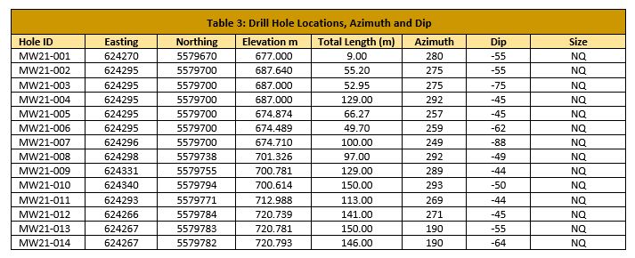 - Half of the initial drillholes terminated prematurely in underground workings often ending in mineralization, for example MW21-003 intersected 1.18 g/t Au and 0.36% Cu over the final 3.30 m and MW21-005 intersected 8.83 g/t Au and 0.37% Cu over the final 1.62 m.