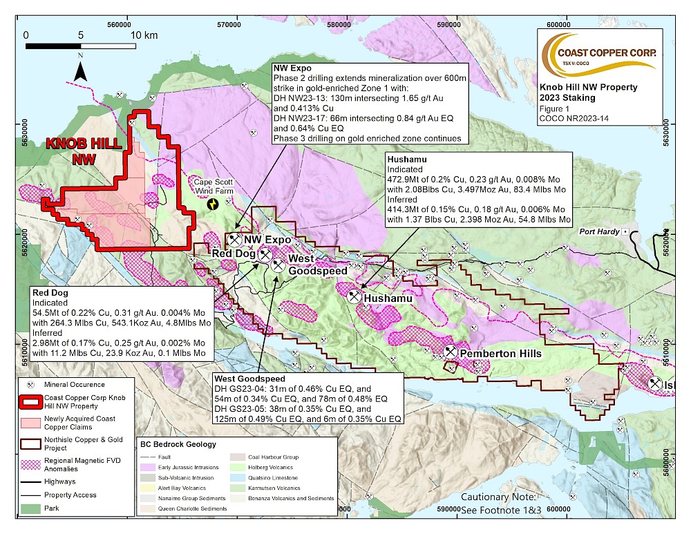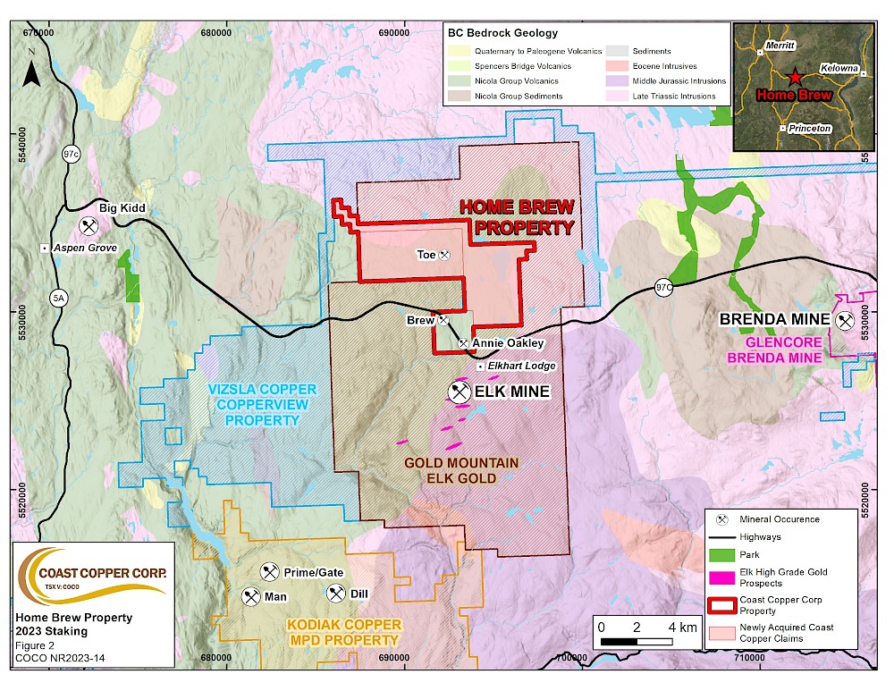 Vancouver, BC – Coast Copper Corp. (“Coast Copper” or the “Company”; TSX-V: COCO) is pleased to announce that it has recently expanded its Knob Hill NW property on northern Vancouver Island and its Home Brew property in southcentral British Columbia (“BC”). In addition to the recent staking, the Company also provides an update on the results from its annual general meeting (“AGM”) held on Thursday, December 7, 2023.