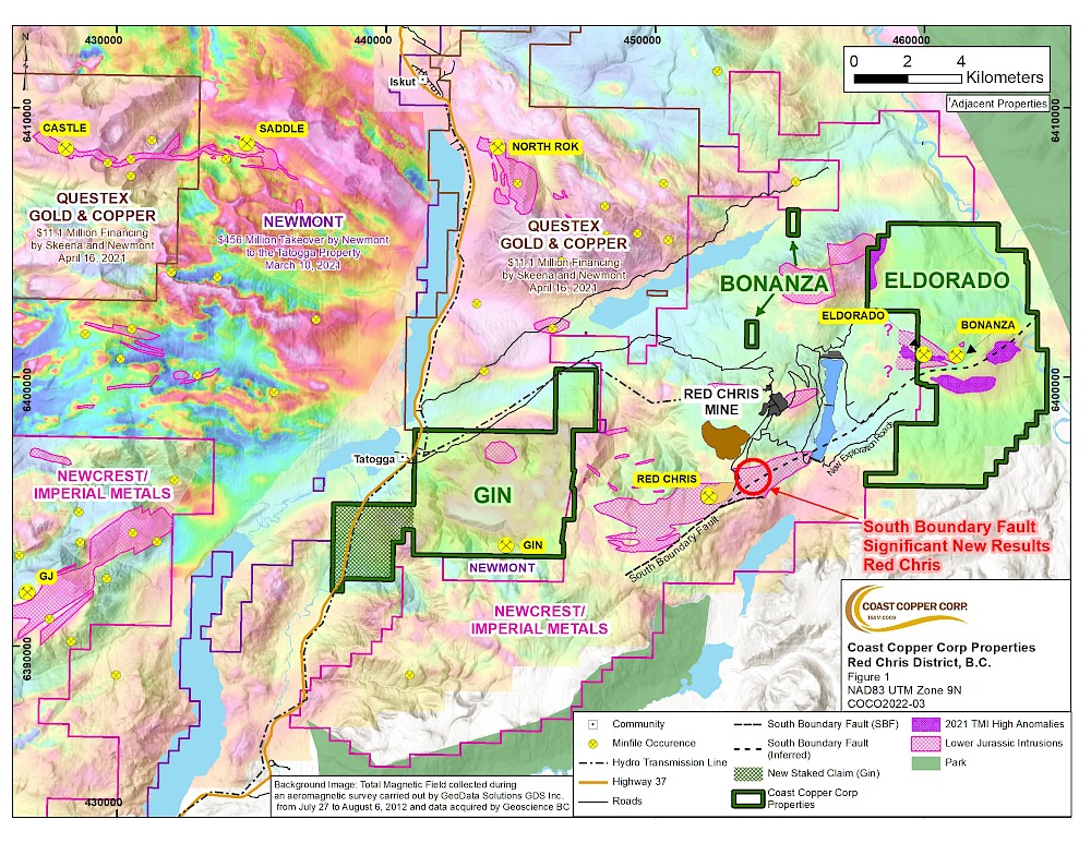 Coast Copper expanded the 100% owned Gin property to include an area to the west, increasing the property size by 726.65 hectares (“ha”), to a total property size of 3,787 ha. These additional claims increase Coast Copper’s land position in the area as well as its position west of the operating Red Chris Mine owned by Newcrest Mining Limited and Imperial Metals Corporation. See Figure 1 for the updated property tenure map location.
