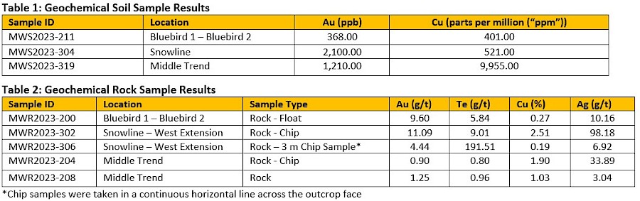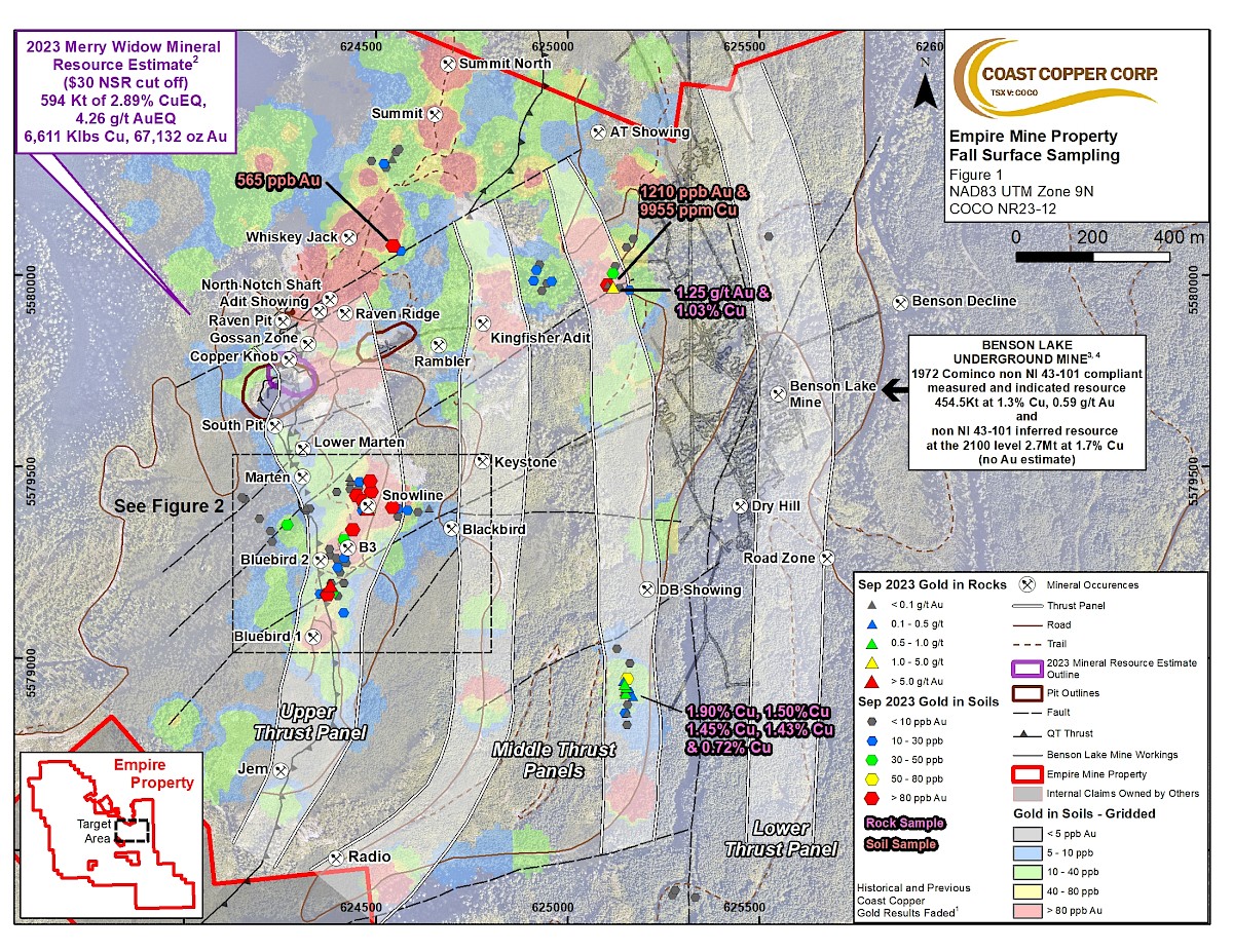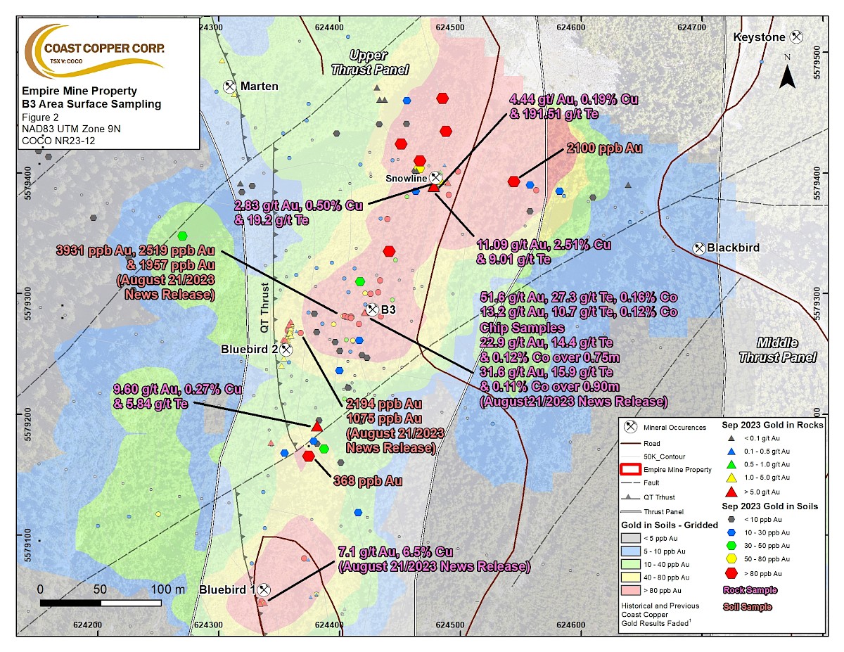 Adam Travis, Coast Copper CEO comments: “With ongoing exploration we continue to expand our understanding, and size potential of mineral occurrences at Empire Mine. We enlarged our coverage around our new B3 discovery, approximately 500 m south of the Merry Widow Pit, and as a result the gold, copper and tellurium anomaly is at least 250 m in strike length. Since the discovery of B3 earlier this year, we have taken a total of 21 soil samples in the area that have returned values greater than 80 parts per billion (“ppb”) gold, with sample MWS2023-018 returning 3,931 ppb Au. This anomaly is open to the north below the historical waste dumps. To the south, a newly discovered rock float sample returned 9.60 g/t Au suggesting a potential link of the B3 area to the Bluebird 1 area 250 metres further to the south where four rock samples have returned greater than 2 g/t Au. We also completed initial prospecting and sampling in the relatively underexplored Middle Trend area between the Upper Trend and Lower Trend returning some highly anomalous copper and gold in rock and soil samples (see Figure 2). This reinforces our model of multiple stacked thrusts, or horizons, that can host mineralization at many levels through the 1 km thick limestone package, and that new discoveries can continue to be made in an old camp.”