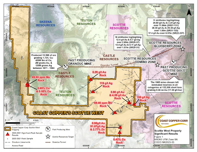 Adam Travis, Coast Copper’s CEO comments: “Upon receiving the property back from EuroPacific, we conducted a review of their work in the context of new discoveries and the work being completed on the adjacent Scottie Resources property. We were excited to see gold in rock samples up to 5.29 g/t which were reported from veins and structures. Some of these appear to be associated with structural and magnetic trends consistent with what has been observed on the Scottie Resources property. I’ve admired Jeff Kyba’s work over the last decade, in both government role and industry, particularly in the Golden Triangle where ’Kyba’s Red Line’ has been an important exploration guide. Jeff joining Coast Copper as a technical advisor speaks volumes about the caliber of our projects and our team. Although Scottie West is not our principal project, and we remain focused on the Empire Mine property, we are very excited to get out on the ground with Jeff and make additional discoveries.”