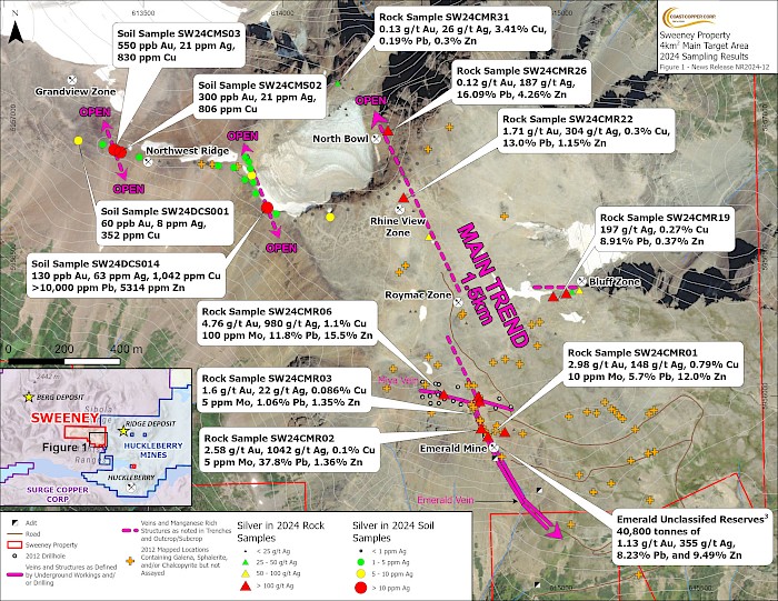 Vancouver, BC – Coast Copper Corp. (“Coast Copper” or the “Company”; TSX-V: COCO) is pleased to report high-grade silver assays from rock and soil samples collected from a 2 square kilometer (“km2”) area on its recently acquired 15 km2 Sweeney property (“Sweeney” or the “Property”) located approximately 135 kilometer (“km”) southwest of the town of Houston in the Central Interior of British Columbia (“BC”). Sweeney is road accessible, centrally located in the Huckleberry Mine Camp and is 7 km north-northwest of the past producing Huckleberry Mine, 3 km west of Huckleberry Mines Ltd.’s Whiting Creek deposit and 8 km southeast of the Berg Deposit owned by Surge Copper Corp¹.