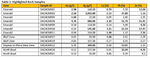 - Roymac to Rhine View: rock grab sample results include 1.71 g/t Au, 304 g/t Ag and 13.01% Pb.