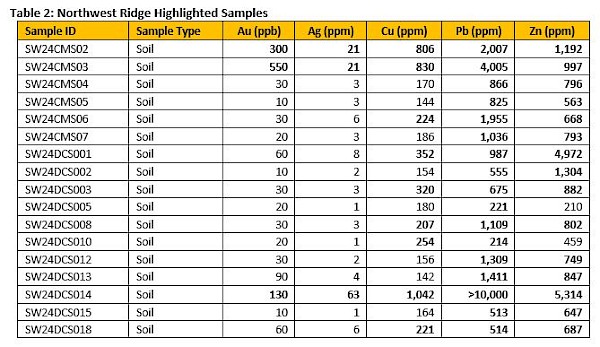 - Northwest Ridge (1,200-1,700 m northeast of Emerald Mine): soil samples returned up to 550 parts per billion (“ppb”) Au, 63.23 parts per million (“ppm”) Ag, 1,042 ppm Cu, >10,000 ppm Pb and 5,374 ppm Zn (see Table 2).