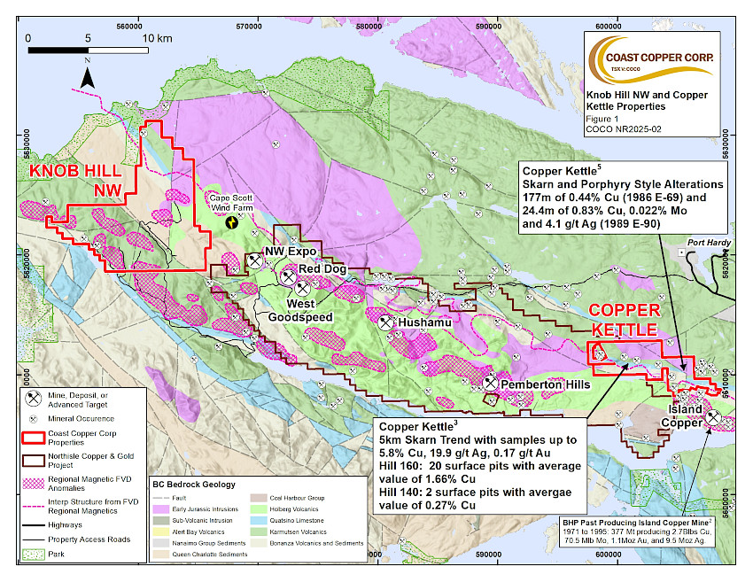 Adam Travis, Coast Copper CEO comments: “We continue to acquire prospective ground in areas of interest at low cost through staking. Our new Copper Kettle property, along with our Knob Hill NW property, which has been the subject of positive advancements since 2021, now bookend the Northisle property and are part of the 50-kilometer prospective trend for porphyry copper-gold deposits that originates at the Island Copper Mine, an open-pit copper mine that operated from 1971 to 1996. We will be completing work on both properties in 2025, as well as numerous other projects. We would like to extend our congratulations to the Northisle team on the recent positive Preliminary Economic Assessment for its North Island project. This advancement further solidifies the past and present potential of northern Vancouver Island.”