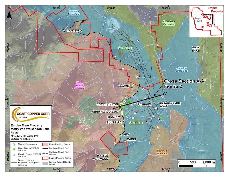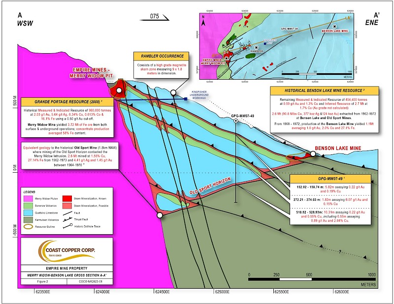 Vancouver, BC – Coast Copper Corp. (“Coast Copper” or the “Company”; TSX-V: COCO) is pleased to announce that since completion of its drill program in 2022 on the optioned Empire Mine property (the “Property”), focus has been on utilizing all recent and historical data available to develop a new geological model that incorporates the structural and lithological controls observed on surface, underground and in drill core. Our new model highlights the potential down dip continuation of near surface, stacked thrust horizons that are associated with copper-gold-iron mineralization observed at the historical Merry Widow Pit approximately 1 kilometer (“km”) east northeast to the Benson Lake Mine. Surface geological observations and mapping, ore mineral occurrences, underground workings and drillhole data also indicate that these thrust horizons and associated mineralization occur along strike over a 5 km northerly trend.