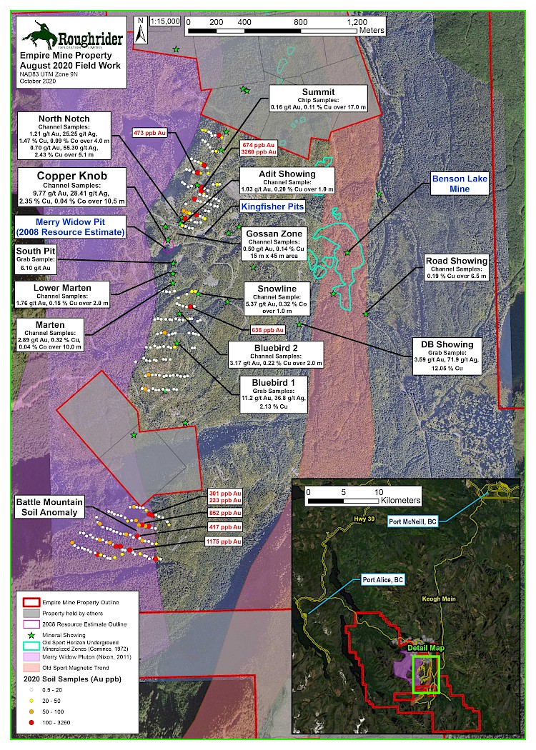 Vancouver, BC -- Roughrider Exploration Limited ("Roughrider"; TSX-V: REL) is pleased to announce the results from the Phase 1 exploration program on the Empire Mine Property located on Northern Vancouver Island. As announced on September 24, 2020, Roughrider completed a small exploration program on the Property which consisted of the collection of 251 soil samples, 81 rock samples, 28 chip samples and 100 rock channel cut samples that were taken at 1.0 m intervals (See Figure 1). Work was focused in a 500 m x 2000 m area (1,000 hectares) within the 15,000-hectare Empire Mine property with an emphasis to test exploration potential outside of the previous resource. As such sampling was not conducted within the historical resource completed by Grande Portage in 2008 or where significant previous drill intercepts (including 2006 drillhole MW06-17 which returned 6.51 g/t gold and 1.38% copper over 50.32 m) were located. 1,2