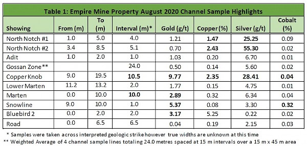 Rock channel sample results are summarized in Table 1 below including results from the Copper Knob showing, which returned 9.77 g/t gold, 28.41 g/t silver and 2.35% copper over 10.5 metres. To the north, channel samples taken at the Gossan Zone, Adit and North Notch showings indicate significant exploration potential in an area up to 250 m north of the Merry Widow Pit. Other channel samples returned highly anomalous results as much as 400 m south of the Merry Widow Pit).
