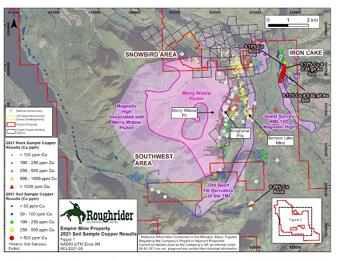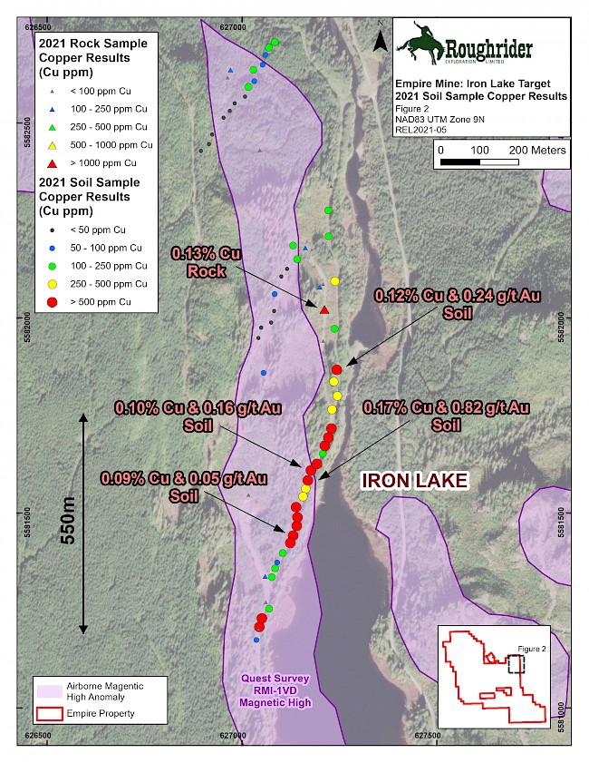 Roughrider was able to complete a small sampling program on the Property in early May before the Company was forced back due to unseasonably wet and snowy conditions. In total, 97 soil samples and 39 rock samples were taken in the area of Iron Lake, see Figures 1 and 2. Sampling highlighted an area with >0.05% copper (“Cu”) and >0.05 grams per tonne (“g/t”) gold (“Au”) over 550 meters (“m”) which remains open to both the west and east. Soil sample D330033 returned 0.17% Cu and 0.82 g/t Au and soil sample D330042 returned 0.12% Cu and 0.24 g/t Au. These elevated grades coincide with a north-south magnetic high similar to what is seen over the Old Sport and Benson Lake Mines (with the exception of the entrance to the No. 1 Decline, the Benson Lake mine workings are located entirely within the Empire Mine Property).