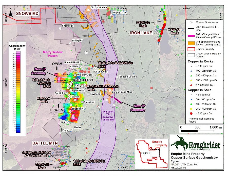Vancouver, BC -- Roughrider Exploration Limited (“Roughrider"; TSX-V: REL) is pleased to announce results of surface exploration and an Induced Polarization (“IP”) ground geophysical program completed this summer at the Empire Mine property (the “Property”) located on northern Vancouver Island. Roughrider has an option to acquire a 100% interest in the Property by making staged cash and share payments and completing certain exploration expenditure commitments (as announced September 24, 2020).