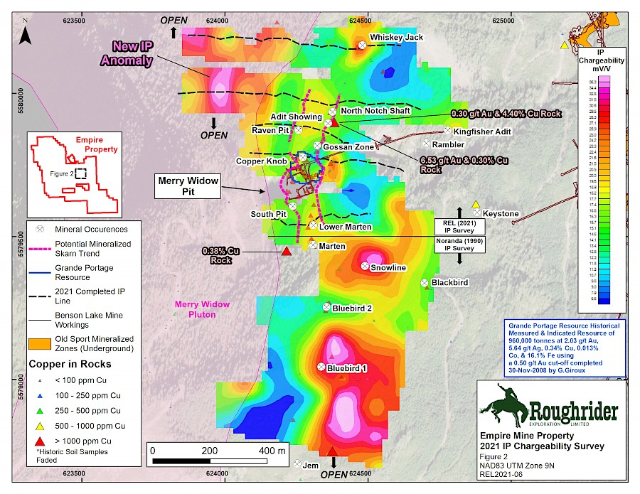 Adam Travis, CEO of Roughrider commented: “In late July, while we had crews on the Property preparing for the IP program we continued prospecting areas that have seen little to no historical exploration outside of the past producing Merry Widow, Kingfisher and Benson Lake Mines. This work led to three new skarn discoveries. These new discoveries show the potential for other new discoveries to be made. While we could easily have rushed to drill (and just twinned some of the historical drillholes such as 2006 drillhole MW06-17 which returned 6.51 grams per tonne (“g/t”) gold and 1.41% copper over 50.32 metres (“m”) without properly understanding the ore-mineralizing system, our systematic and thorough compilation of over 100 years of historical data and methodical surface exploration is now paying off. The discovery of new gold, copper and zinc showings along with new strong and significant IP anomalies as much as 2 kilometres (“km”) away from previous workings indicates that the Empire Mine area is part a much larger mineralized system than previously known.”