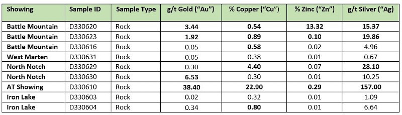 Rock and soil sampling was focused over the Battle Mountain, Iron Lake and North Notch areas (see Figure 1). In total, 29 rock samples and 63 soil samples were collected. Rock sample highlights are included in the following table.