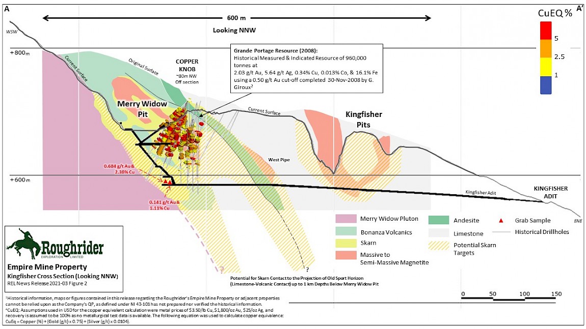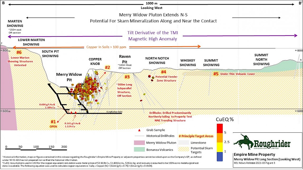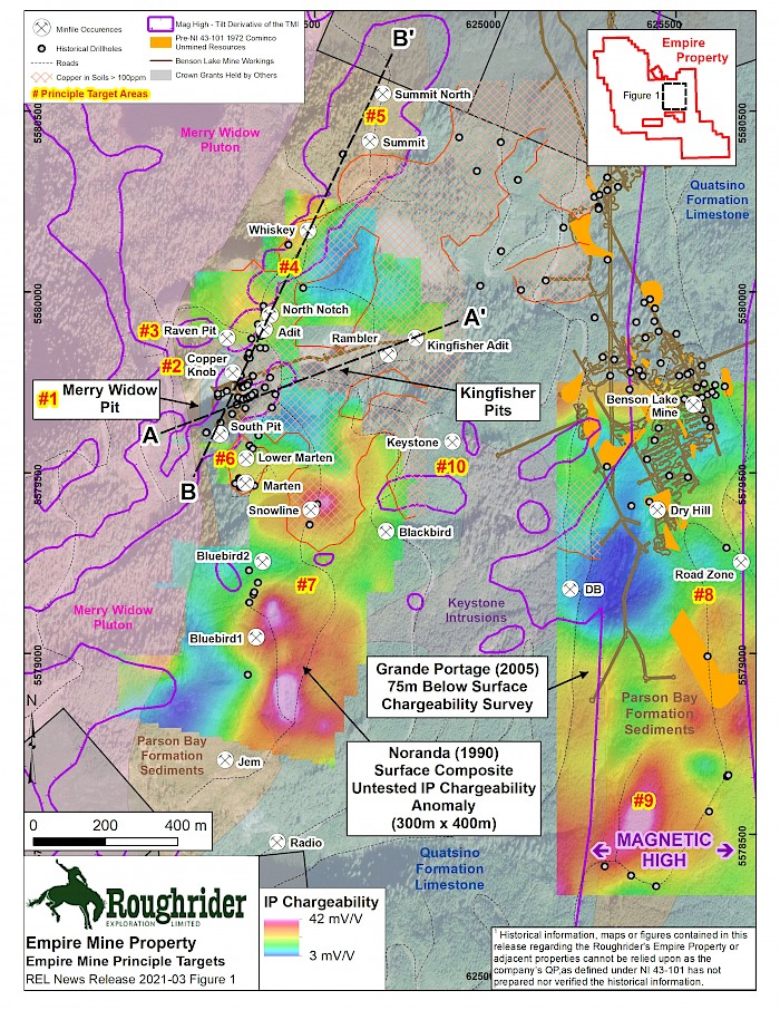 Adam Travis, Roughrider CEO and Director comments: “We recognized the copper-gold exploration potential at Empire from our first property examination and our initial review of historical records. It was clear that historic exploration focused on only two zones: Empire Mines Merry Widow and Kingfisher open pits and the underground Benson Lake mine operated by Cominco in the 1970s. Our compilation work is indicating at least 10 principal targets in a 2 km x 2 km area around these former producing mines. It is also important to note that these targets are concentrated in <5 % of the overall property, indicating it's a great starting point but we've a much larger area still to evaluate. Indeed, through analyzing the last significant work programs, we have greatly advanced our knowledge of the entire Property and generated several significant exploration targets that were not tested during the last phase of these historical exploration programs which took place relatively recently between 2006 and 2010.”