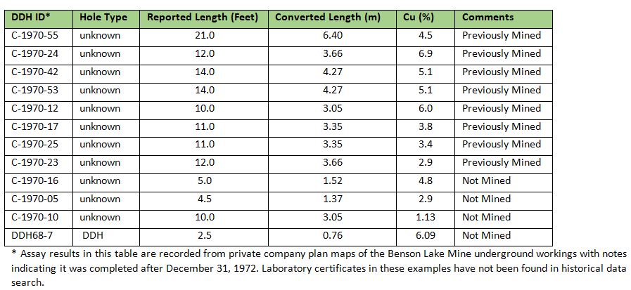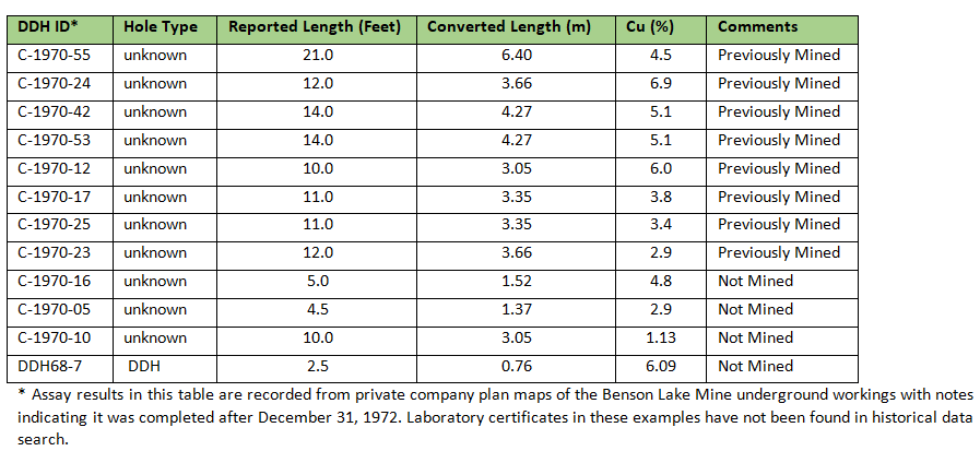 Table 2: Benson Lake Mine - Old Sport Horizon Historical Underground Drill Drilling Significant Intercepts ¹¹